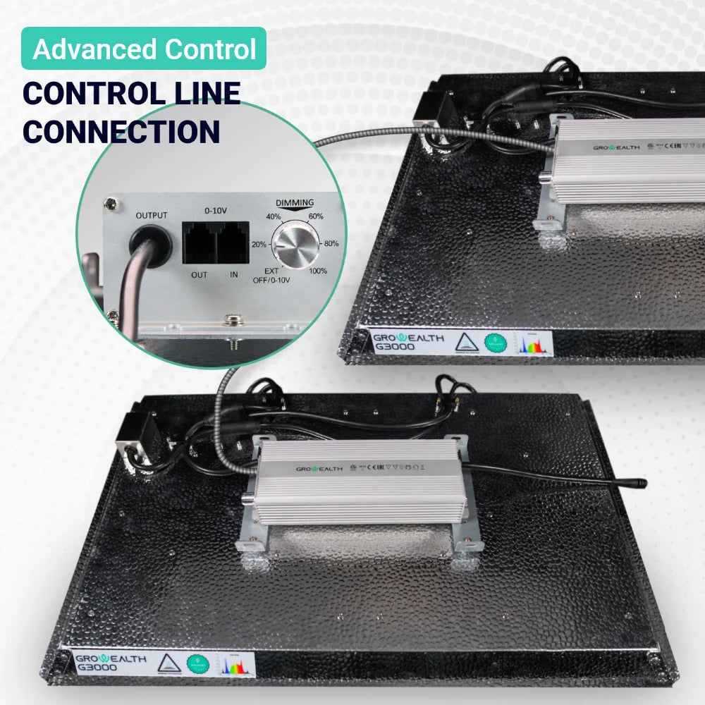 The Growealth G3000 is the new generation of high-efficiency 300W LED grow lights that produce up to 2.65umol/J. These lights are equipped with the latest Samsung LM301B LEDs.